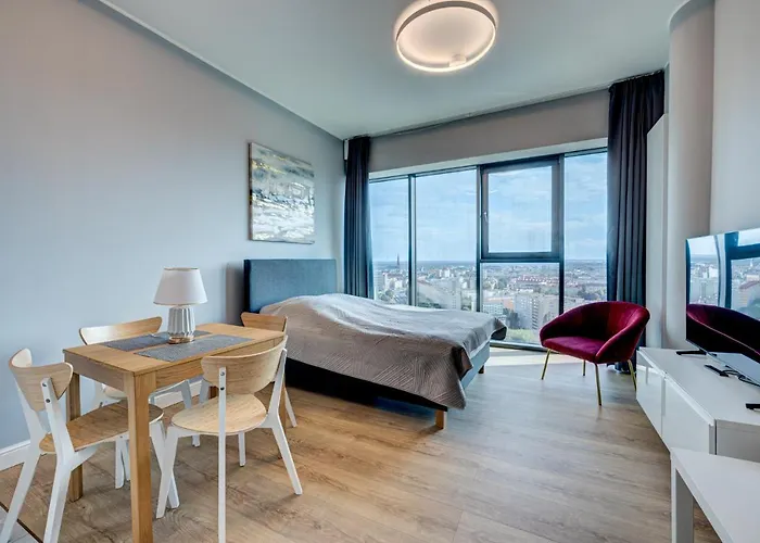 Hanza Tower Swimming Pool & Spa 18 Floor Great View Studio ferielejlighed ligger 2 km fra Sankt Jacob katedral og tilbyder en privat pool. Gæsterne kan også besøge Rosenhaven inden for 5 minutters kørsel.